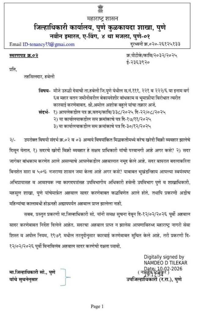 मा. जिल्हाधिकारी, पुणे यांनी या प्रकरणी थेट हस्तक्षेप करत दि. १२ फेब्रुवारी २०२६ पूर्वी अहवाल सादर करण्याचे स्पष्ट निर्देश दिले असून, आदेशांचे पालन न झाल्यास संबंधित अधिकाऱ्यांविरोधात महाराष्ट्र नागरी सेवा (शिस्त व अपील) नियम, १९७९ अंतर्गत शिस्तभंगाची कारवाई करण्यात येईल, असा कडक इशाराही देण्यात आला आहे.